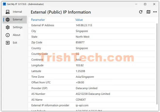 Get My IP is a free Windows program by developer Timthreetwelve that puts that answer right on your desktop, without opening a browser. It is not just a number viewer. It shows your internal and external addresses, adds location data, and lives quietly in your system tray until you need it.